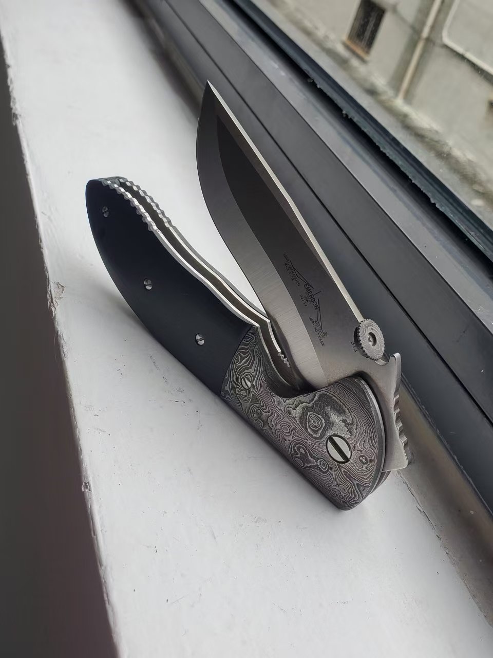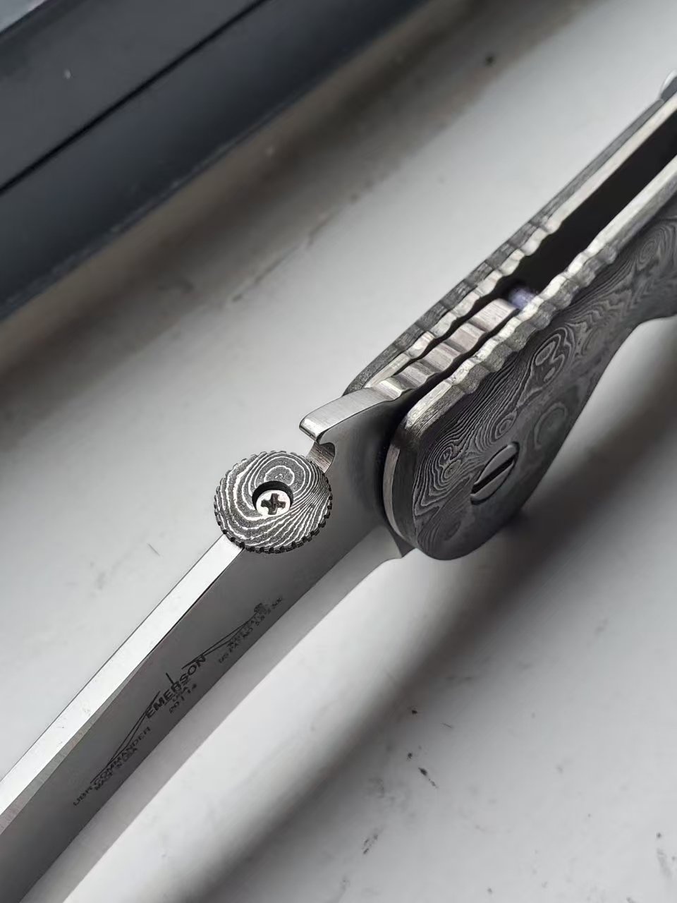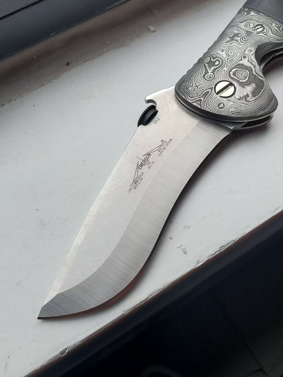爱默生poboy UBR指挥官图片,非常罕见的停产型号,加拿大kahless改装,大马士革刀枕+推刀盘,全长26.5cm为量产指挥官型号中最大。(指挥官6种尺寸,ubr仅次于手工木星)(裸刀图片无其他