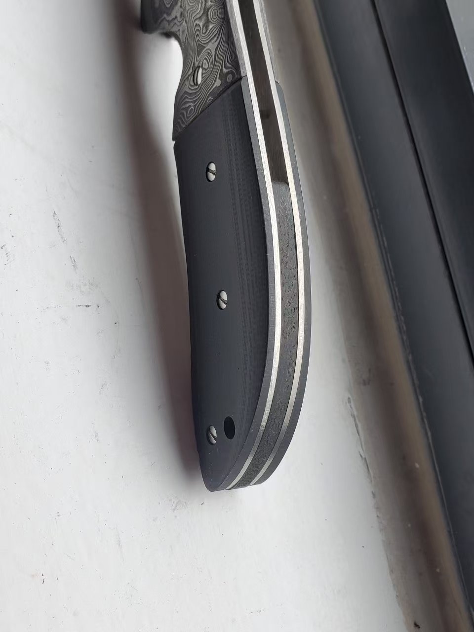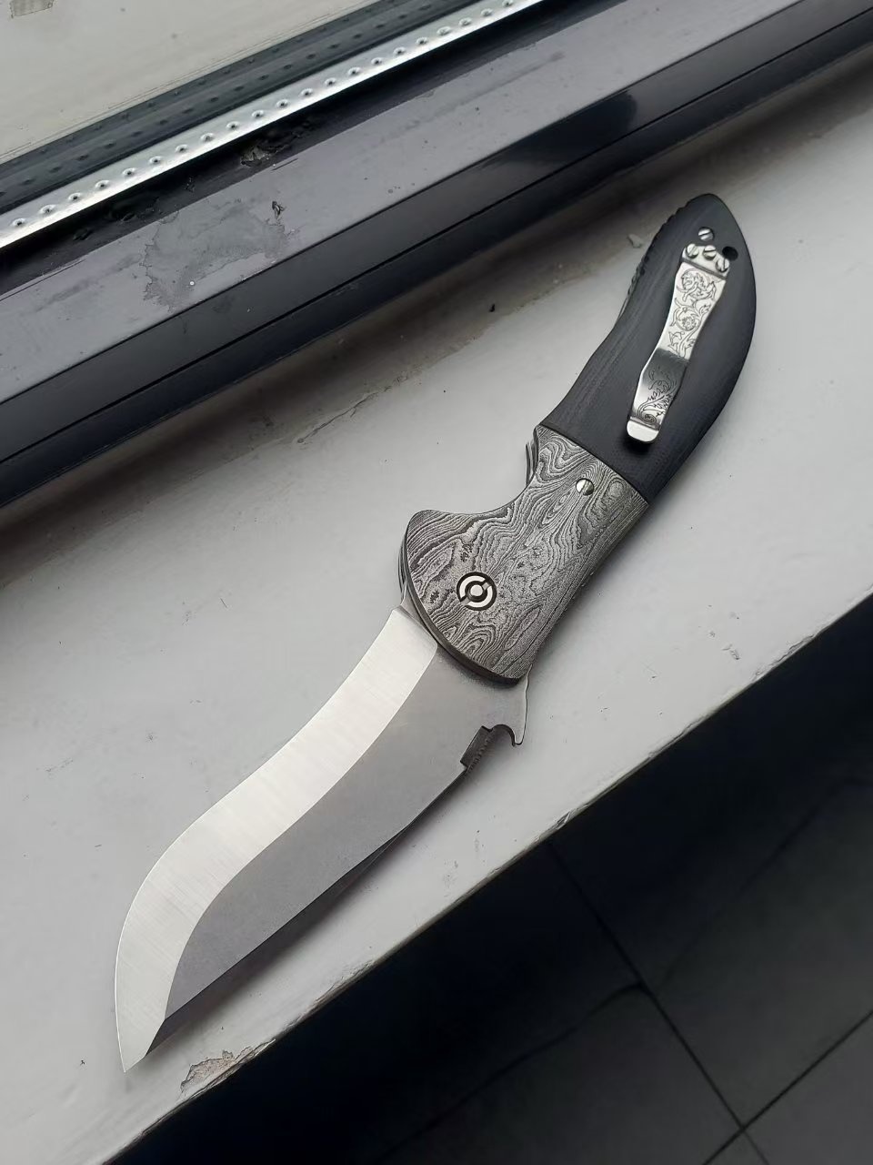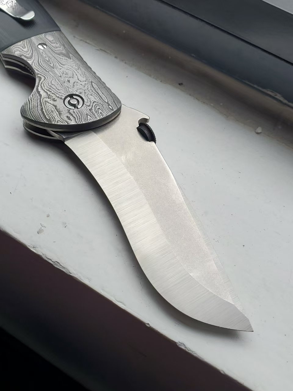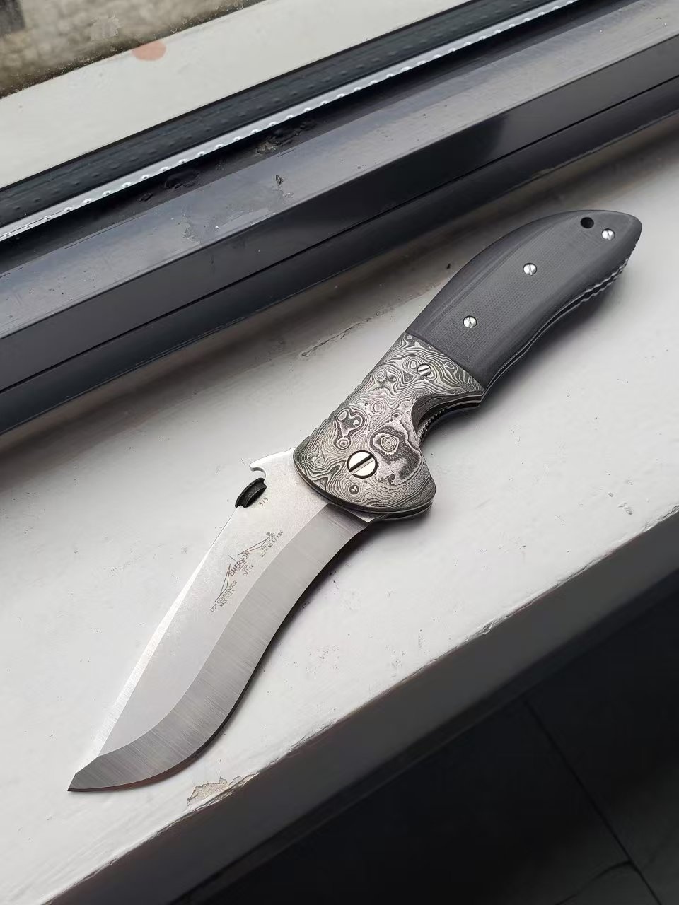 爱默生poboy UBR指挥官图片,非常罕见的停产型号,加拿大kahless改装,大马士革刀枕+推刀盘,全长26.5cm为量产指挥官型号中最大。(指挥官6种尺寸,ubr仅次于手工木星)(裸刀图片无其他